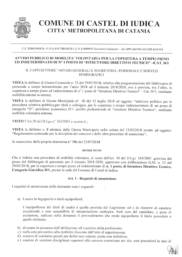 Avviso pubblico di mobilità volontaria per la copertura a tempo pieno ed indeterminato di n. 1 posto di "Istruttore Direttivo Tecnico" - Cat. D/1