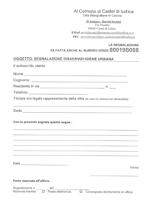 Per eventuali disservizi si allega Modello Segnalazione disservizi igiene urbana e numero verde 800198088 per le segnalazioni