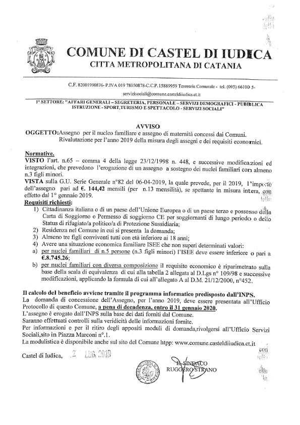 AVVISO ASSEGNO PER IL NUCLEO FAMILIARE E ASSEGNO DI MATERNITÀ CONCESSI DAI COMUNI RIVALUTAZIONE PER L'ANNO 2019 DELLA MISURA DEGLI ASSEGNI E DEI REQUISITI ECONOMICI SCADENZA DOMANDA 31 GENNAIO 2020