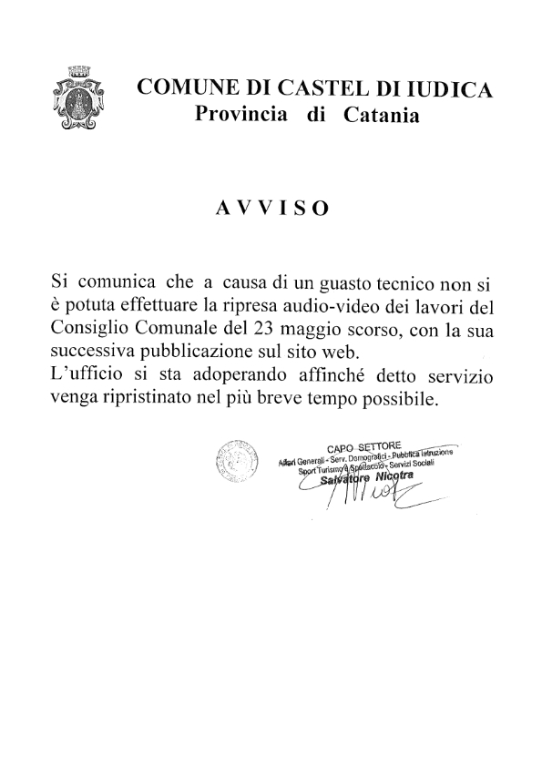 AVVISO COMUNICAZIONE PER CAUSA GUASTO TECNICO NON SI È POTUTA EFFETTUARE LA RIPRESA AUDIO-VIDEO DEL CONSIGLIO COMUNALE DEL 23 MAGGIO