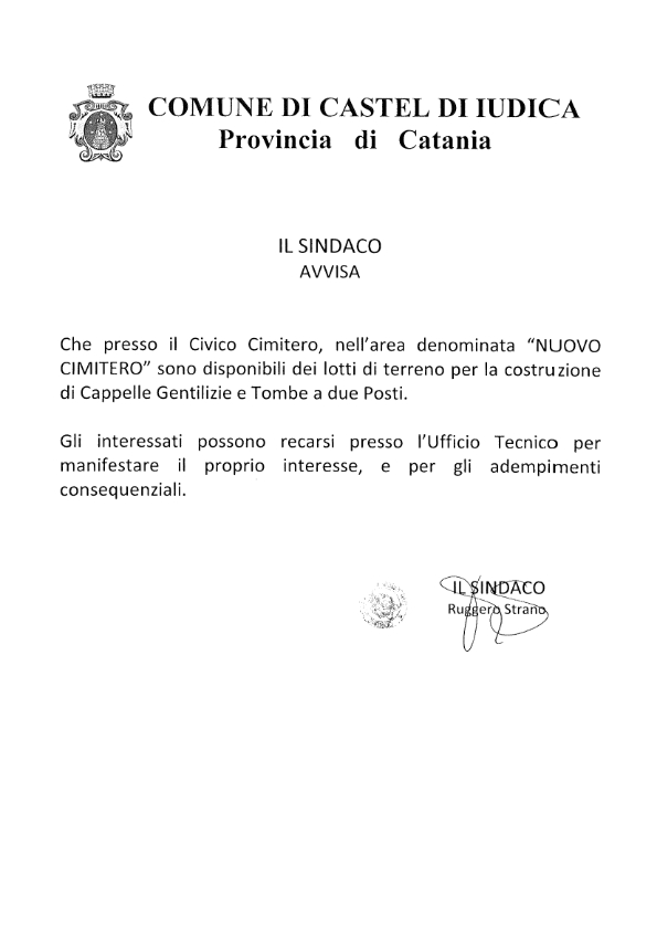 AVVISO DISPONIBILITÀ DI LOTTI DI TERRENO PER LA COSTRUZIONE DI CAPPELLE GENTILIZIE E TOMBE A DUE POSTI