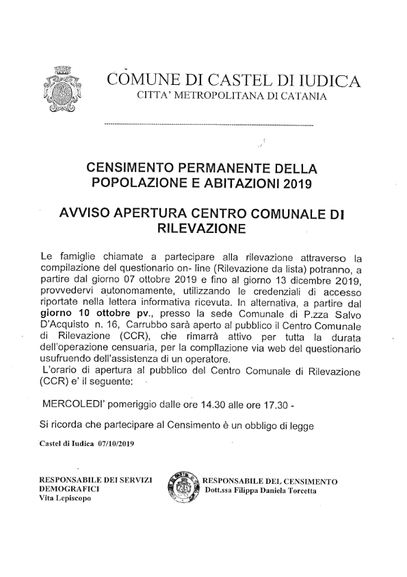 - CENSIMENTO PERMANENTE DELLA POPOLAZIONE E ABITAZIONE 2019- AVVISO APERTURA CENTRO COMUNALE[.pdf 57,04 Kb - 08/10/2019]