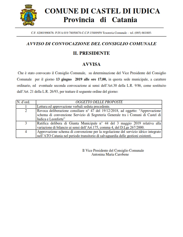 - CONVOCAZIONE DEL CONSIGLIO COMUNALE PER IL 13 GIUGNO 2019 ORE 17[.doc 196,5 Kb - 06/06/2019]