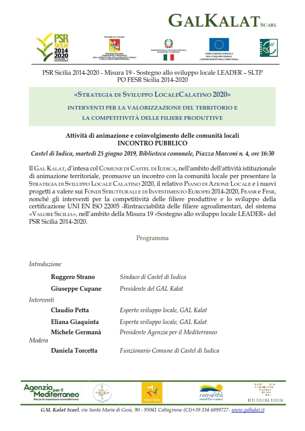 INCONTRO PUBBLICO GIORNO 25 GIUGNO 2019 ORE 16:00 PRESSO BIBLIOTECA COMUNALE" STRATEGIA DI SVILUPPO LOCALE CALATINO 2020"