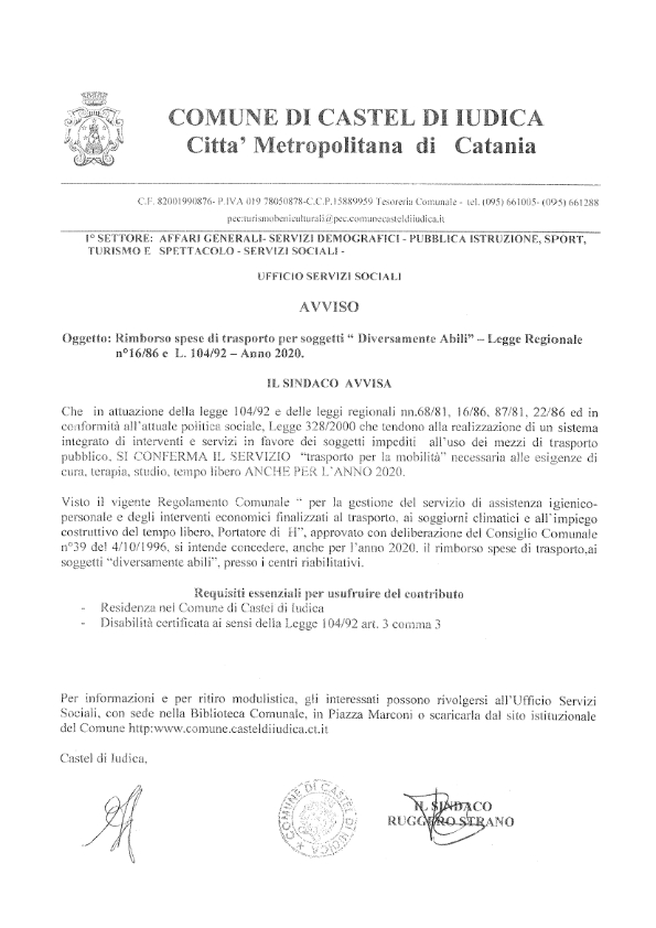 RIMBORSO SPESE DI TRASPORTO PER SOGGETTI DIVERSAMENTE ABILI ANNO 2020