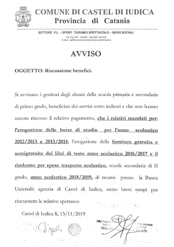 RISCOSSIONE BENEFICI PER I MANDATI DELLE BORSE DI STUDIO ANNO 2012/13-2013/14- FORNITURA GRATUITA LIBRI DI TESTO ANNO 2016/17- TRASPORTO SCOLASTICO ANNO 2018/19