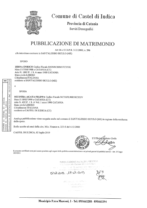 Pubblicazione di matrimonio tra Ierna marco e Nicotra agata filippa