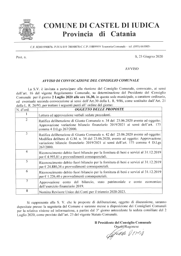 - AVVISO DI CONVOCAZIONE DEL CONSIGLIO COMUNALE PER IL GIORNO 2 LUGLIO[.pdf 80,85 Kb - 25/06/2020]