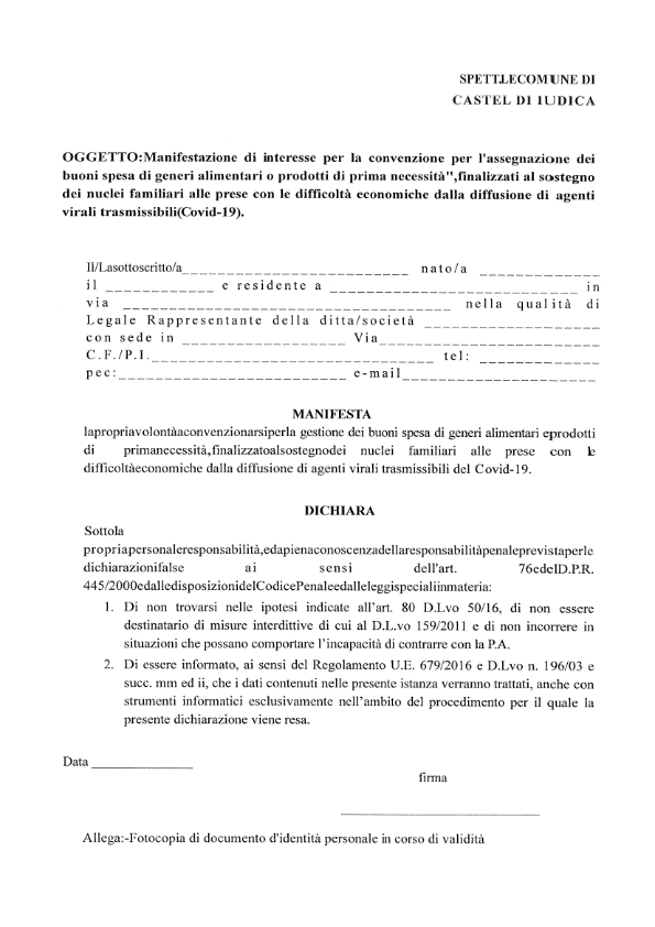 - MANIFESTAZIONE DI INTERESSE PER LA CONVENZIONE PER L'ASSEGNAZIONE DEI BUONI SPESA[.pdf 50,17 Kb - 02/04/2020]