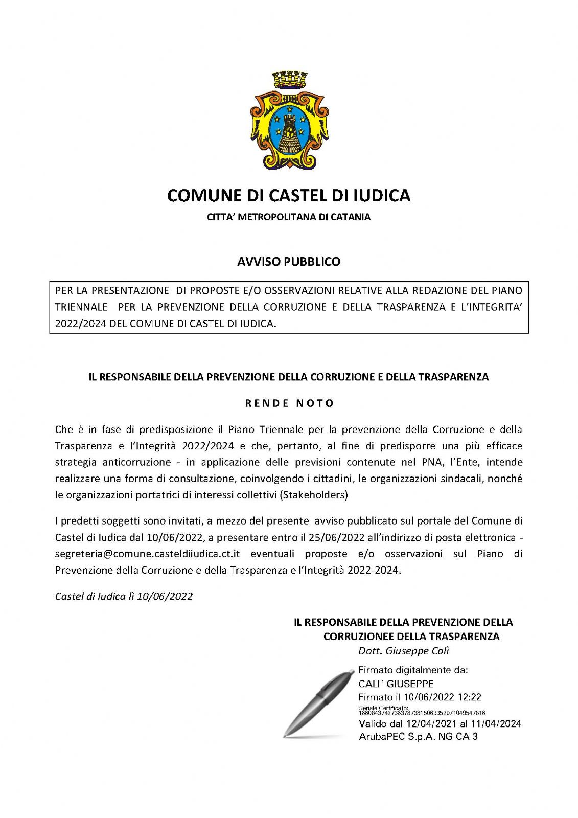 AVVISO PUBBLICO PER LA PRESENTAZIONE DI PROPOSTE E/O OSSERVAZIONI RELATIVE ALLA REDAZIONE DEL PIANO TRIENNALE PER LA PREVENZIONE DELLA CORRUZIONE E DELLA TRASPARENZA E L’INTEGRITA’ 2022/2024 DEL COMUNE DI CASTEL DI IUDICA