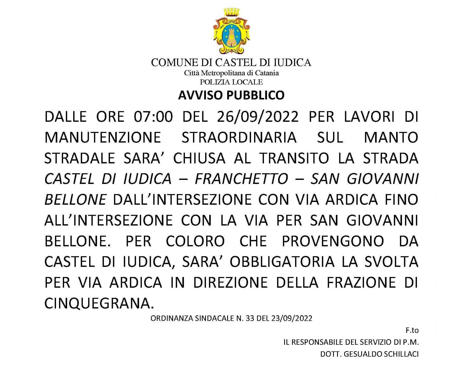 DALLE ORE 07:00 DEL 26/09/2022 PER LAVORI DI MANUTENZIONE STRAORDINARIA SUL MANTO STRADALE SARA’ CHIUSA AL TRANSITO LA STRADA CASTEL DI IUDICA – FRANCHETTO – SAN GIOVANNI BELLONE DALL’INTERSEZIONE CON VIA ARDICA FINO ALL’INTERSEZIONE CON LA VIA PER SAN GIOVANNI BELLONE. PER COLORO CHE PROVENGONO DA CASTEL DI IUDICA, SARA’ OBBLIGATORIA LA SVOLTA DA VIA ARDICA IN DIREZIONE DELLA FRAZIONE DI CINQUEGRANA.